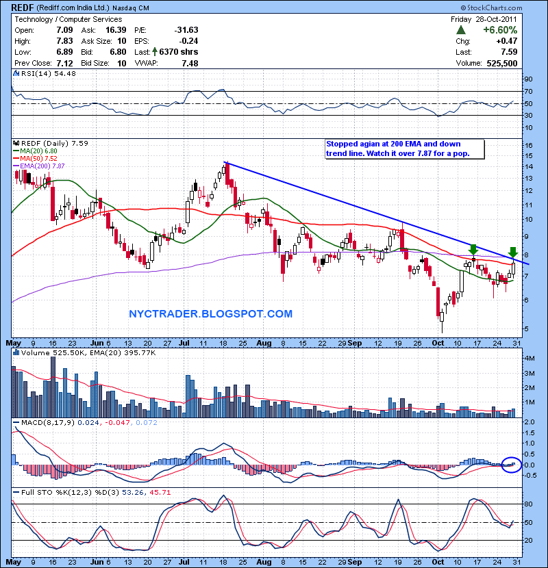 | REDF Stopped again at 200 EMA and downtrend line, Watch it over 7.87 for a pop. |